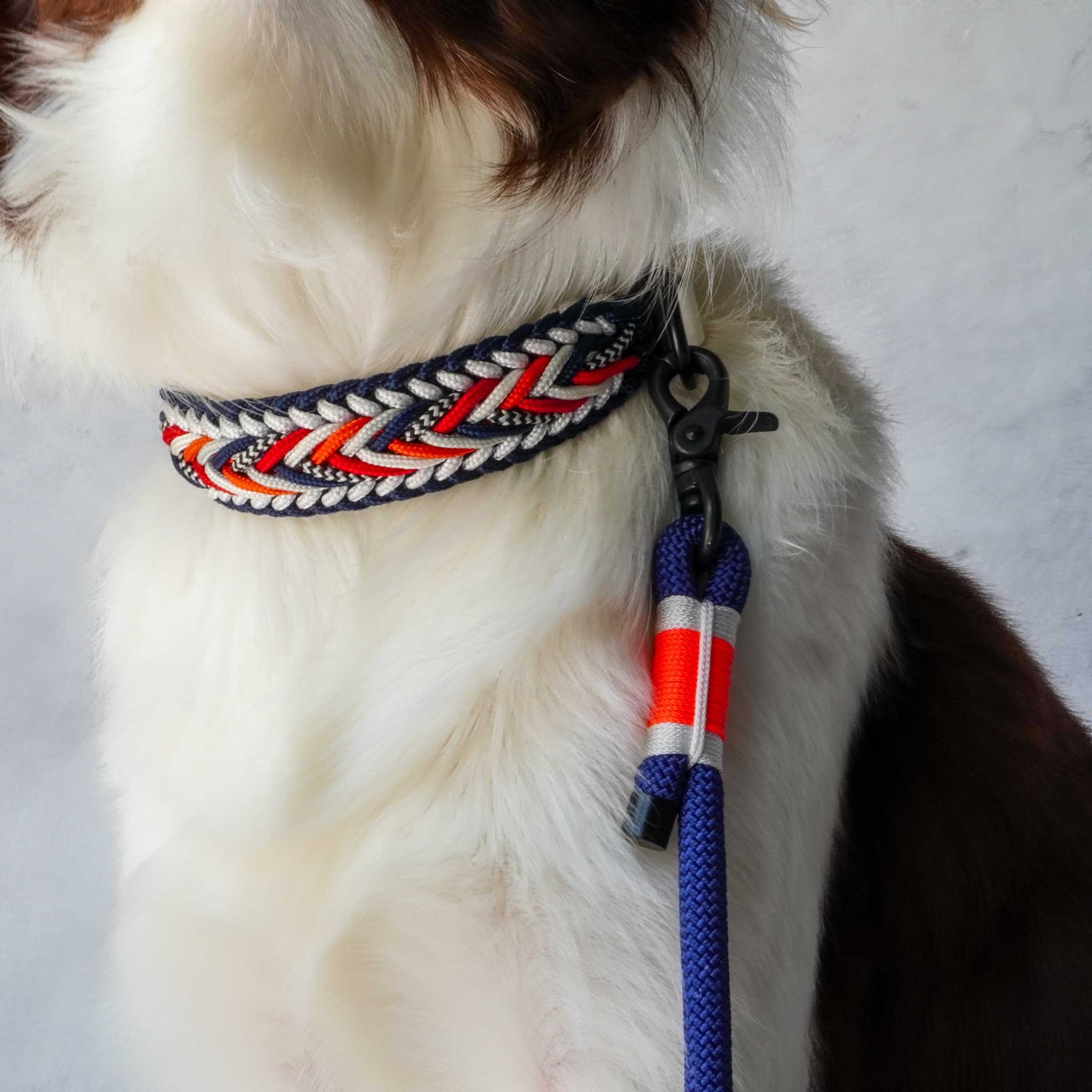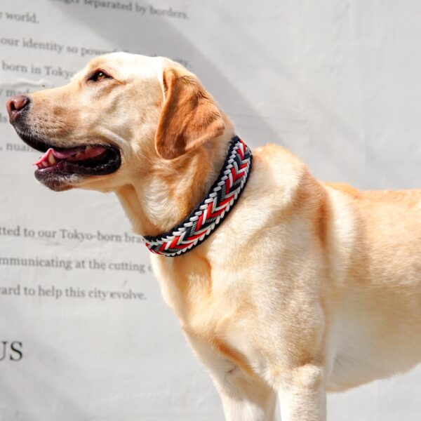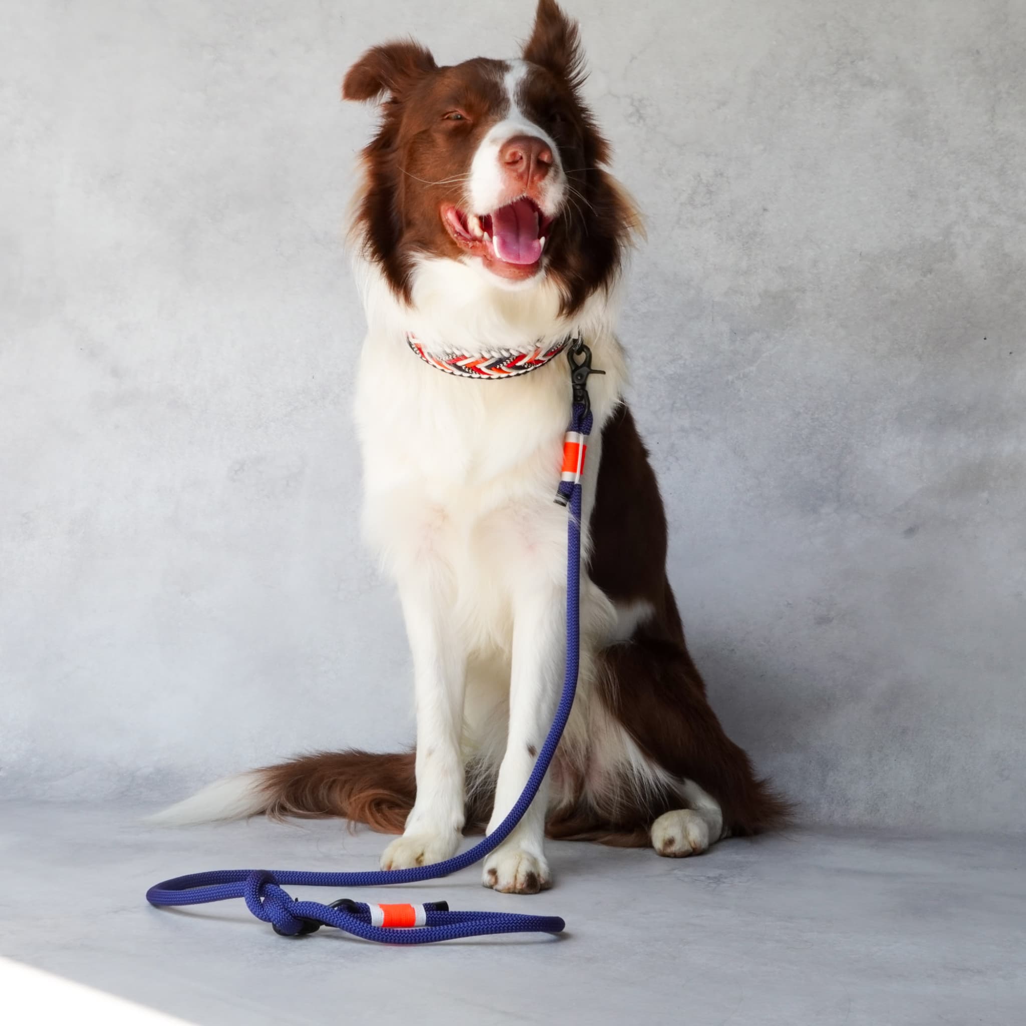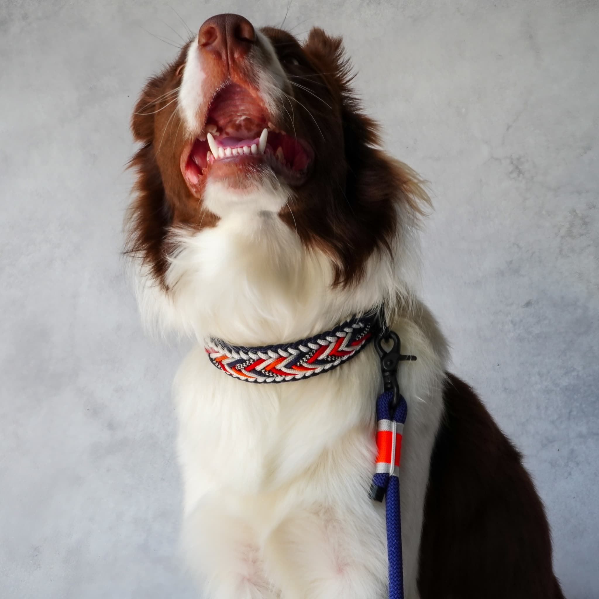アクティブなライフスタイルにフィットするよう、スポーティな配色を意識してデザインされました。燃え上がるような赤とオレンジの差し色がスピード感とエネルギーを象徴し、どんなシーンでも目を引きます。ネイビーとホワイトの編み込みが全体を引き締め、スタイリッシュでモダンな印象をプラス。常に前へ進む「フレア」で、愛犬とともにスポーティな毎日を楽しんでください。