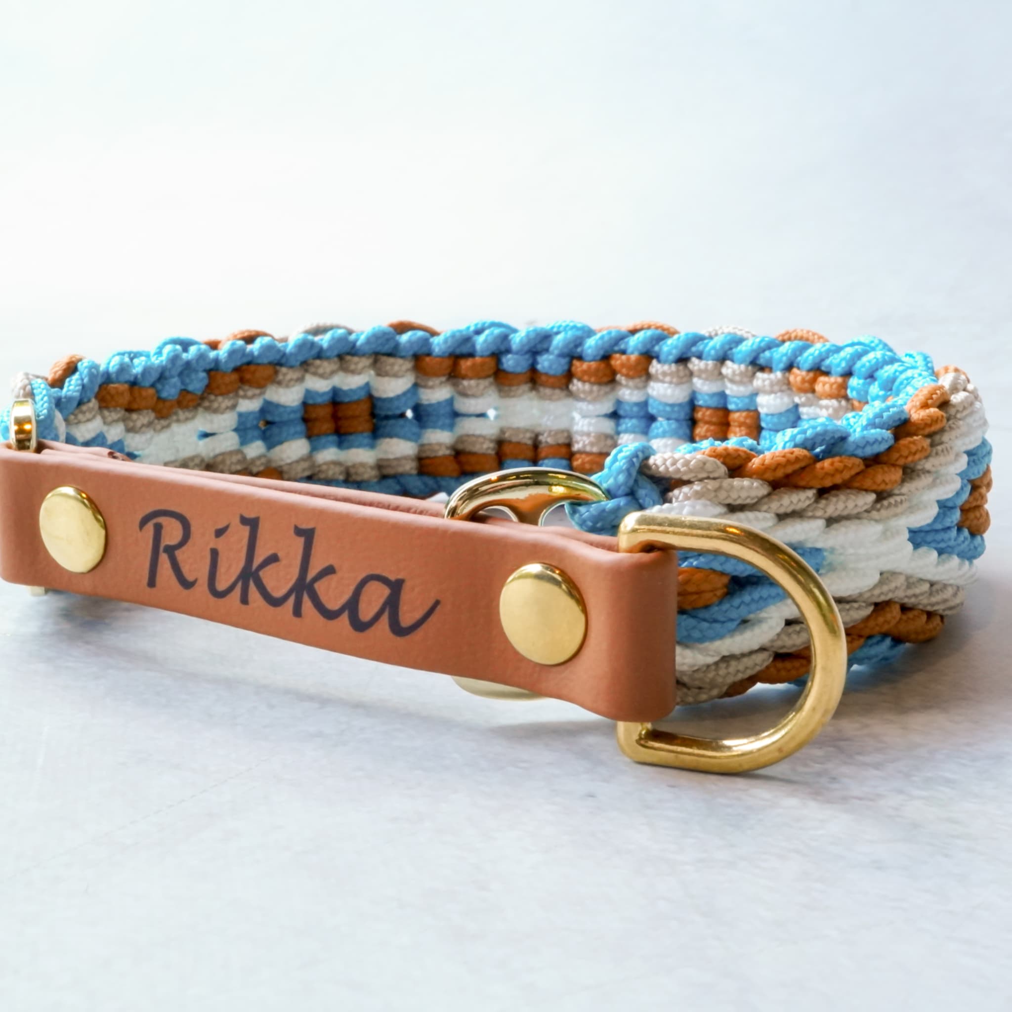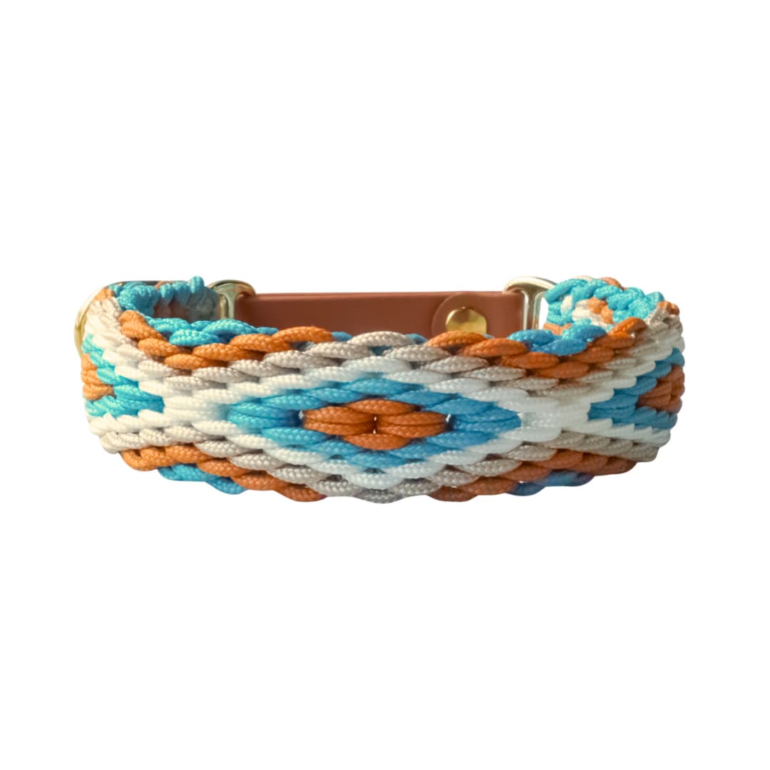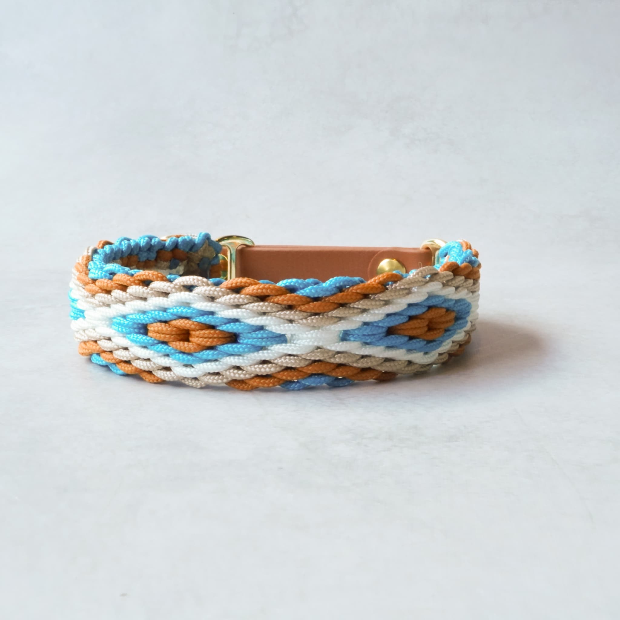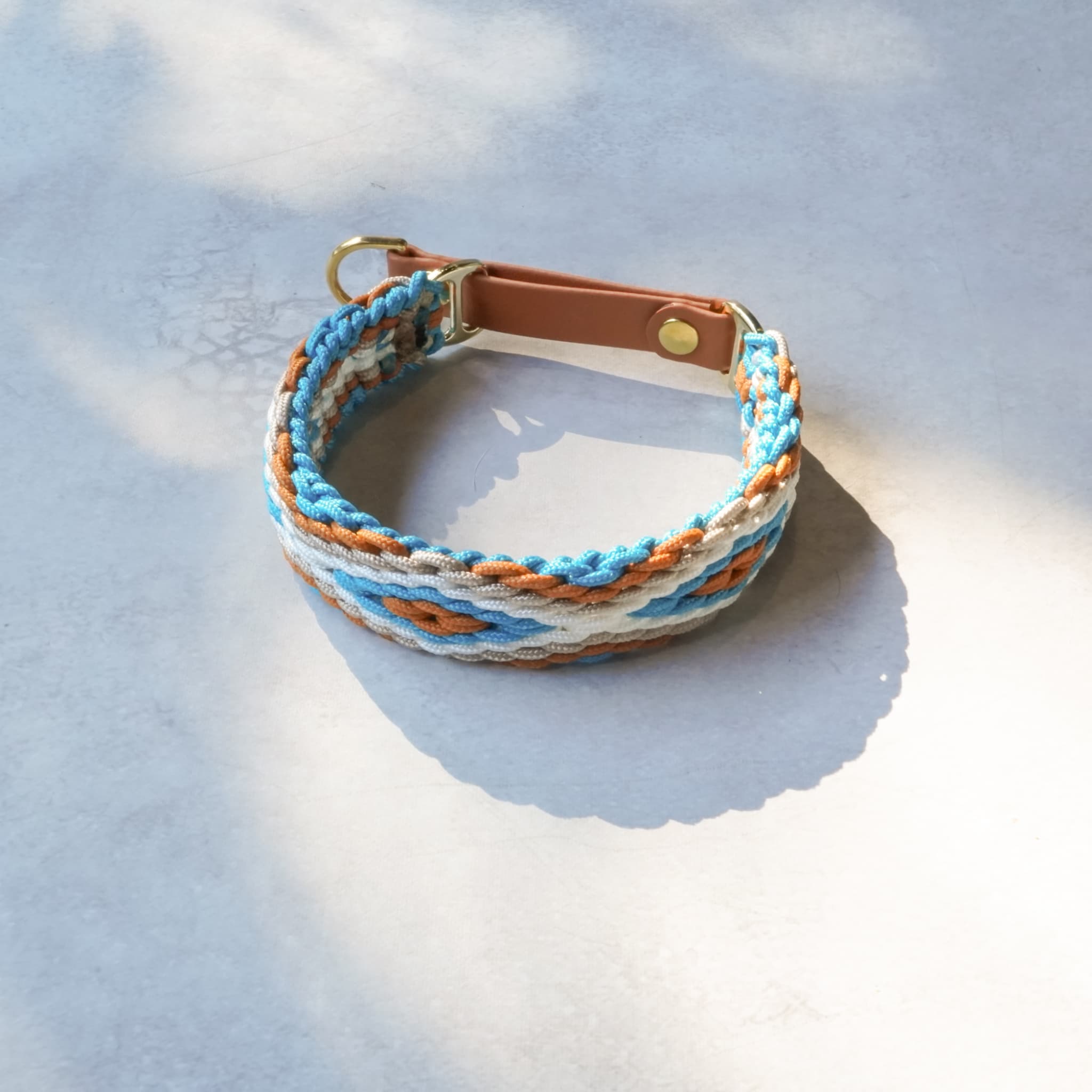 落ち着いたアースカラーに鮮やかなターコイズが映え、ワンちゃんの毛色やコーデに自然と溶け込みます。