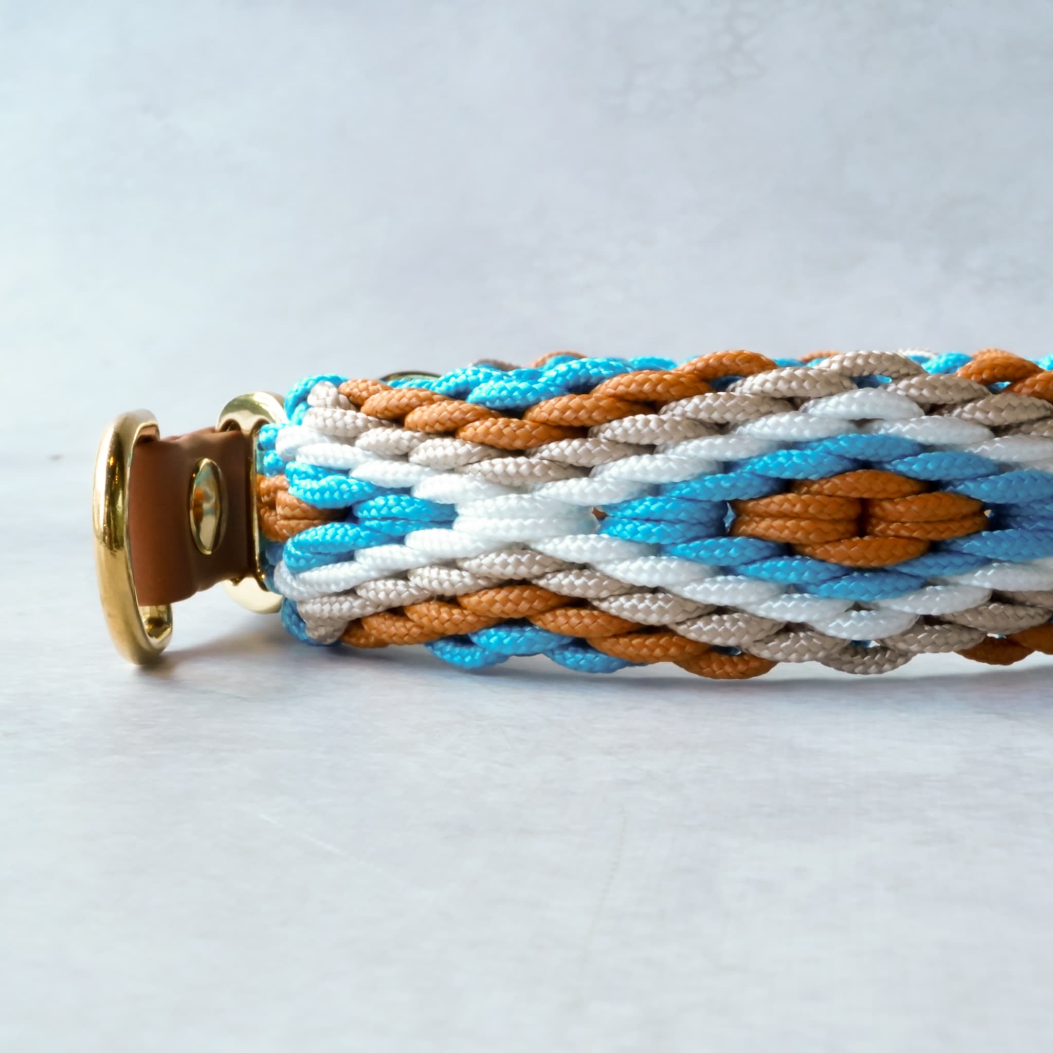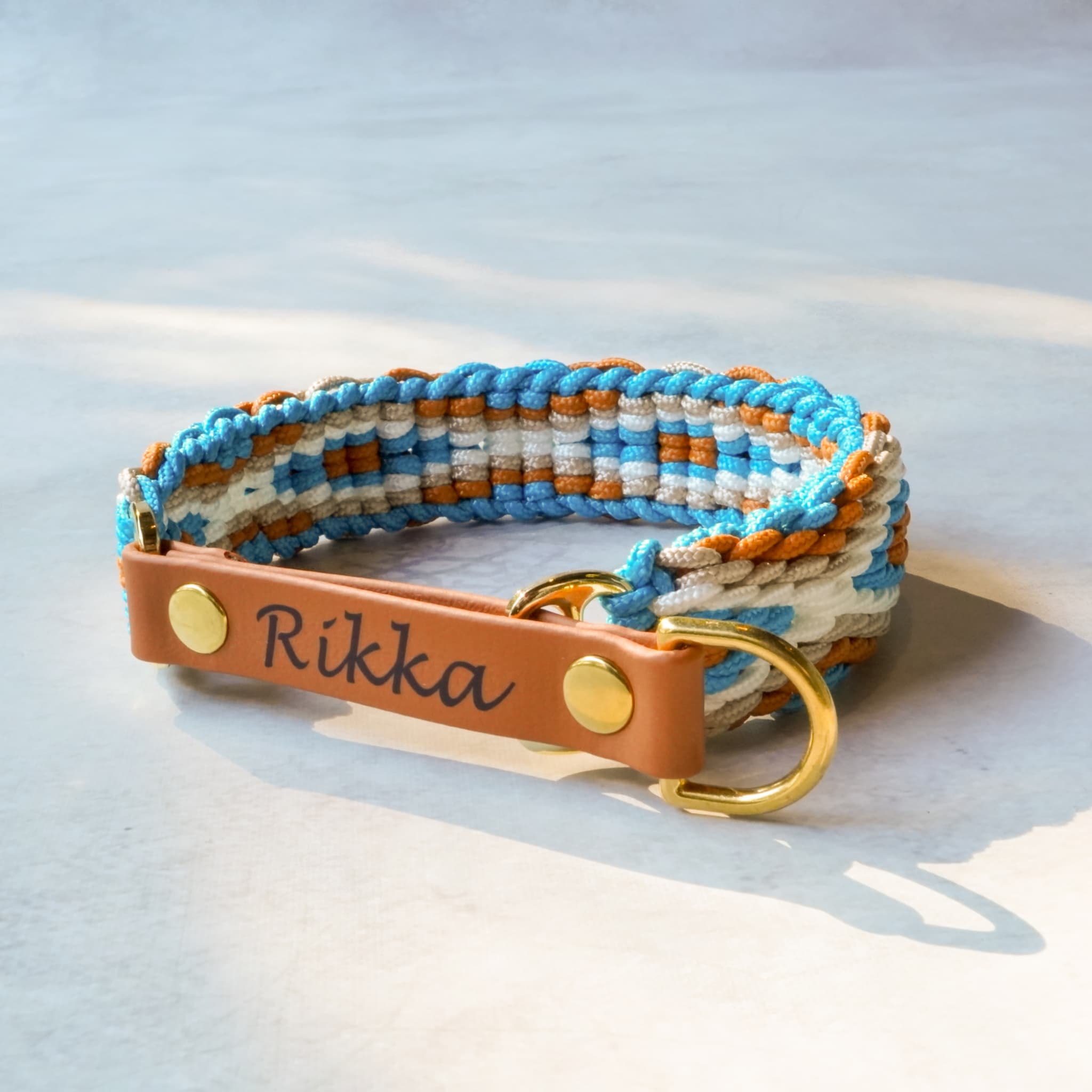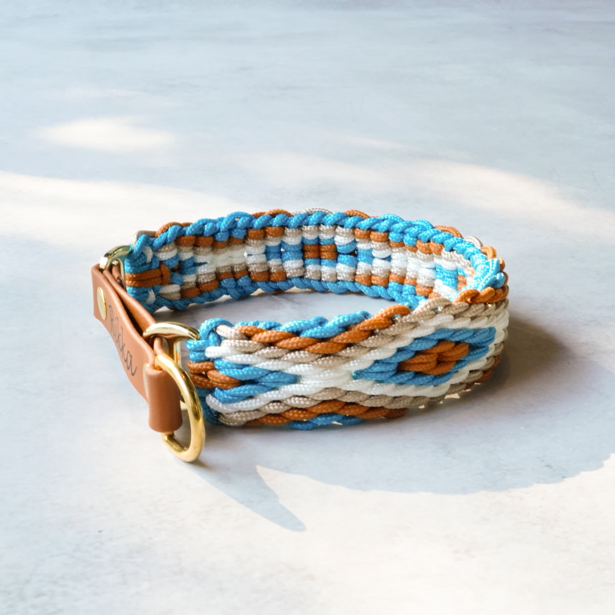 落ち着いたアースカラーに鮮やかなターコイズが映え、ワンちゃんの毛色やコーデに自然と溶け込みます。