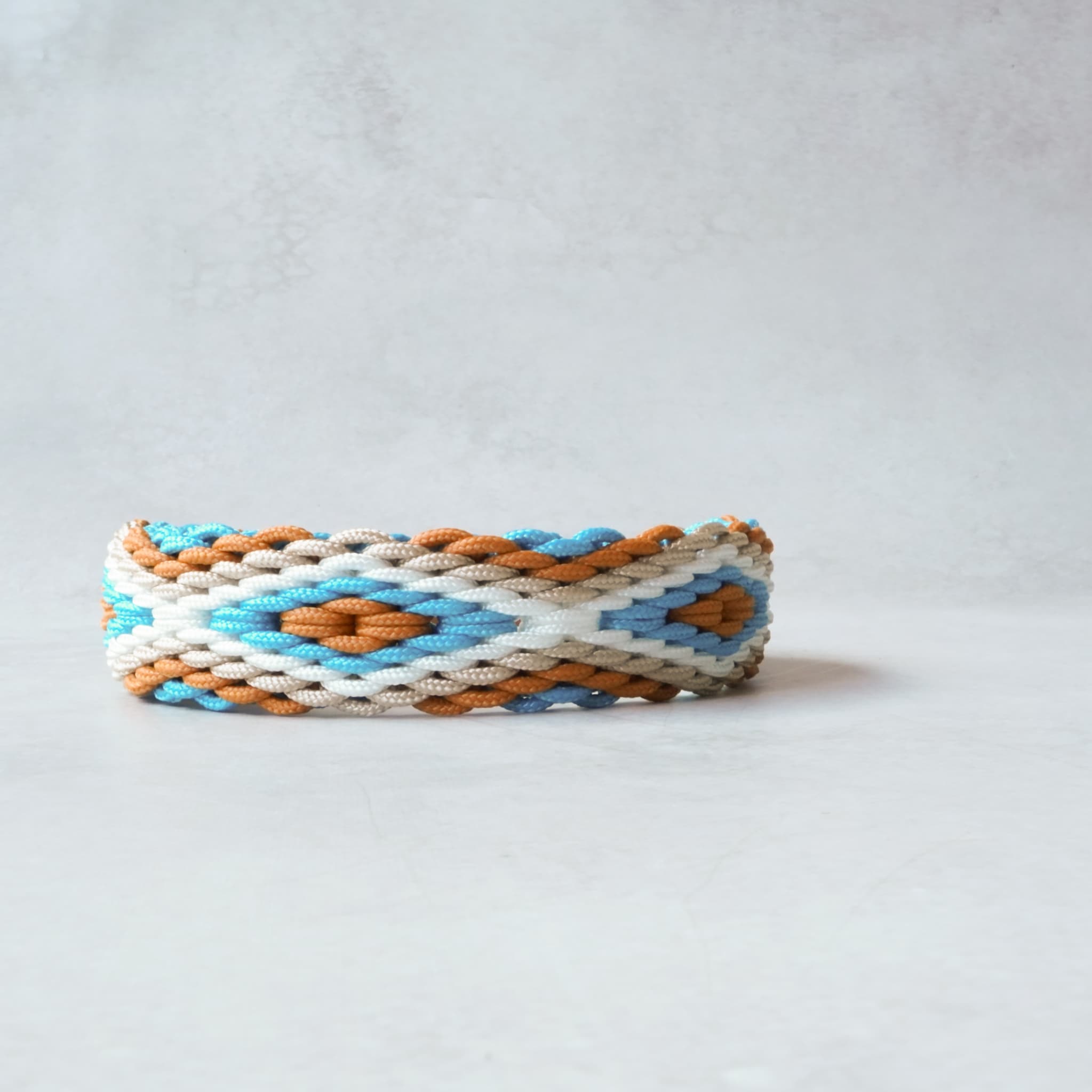「ミヨー」デザインは、ミヨー橋の細く美しいケーブルをイメージして名づけられました。特徴的な菱形模様は、パラコードが規則正しく交差することで生まれる立体感のある編み方で、首元にしっかりとした存在感を与えます。